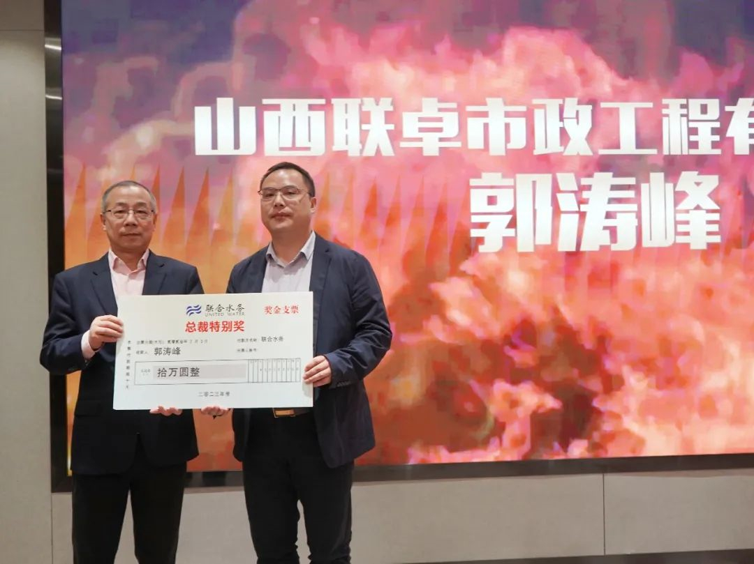 俞總作總結(jié)發(fā)言 會(huì)上,俞總向大家分析了當(dāng)前國內(nèi)外經(jīng)濟(jì)形勢(shì),分析了行業(yè)趨勢(shì),提出在新的一年,聯(lián)合水務(wù)將開啟新的發(fā)展征程。2023年,我們將面臨新的環(huán)境要求,我們要充分發(fā)揮新的平臺(tái)優(yōu)勢(shì),緊緊圍繞“主業(yè)清晰、業(yè)績(jī)?cè)鲩L(zhǎng)、運(yùn)營(yíng)高效”的企業(yè)價(jià)值目標(biāo),勵(lì)精圖治,高質(zhì)量提升存量業(yè)務(wù),切實(shí)完成業(yè)績(jī)目標(biāo),不斷提升管理效率,運(yùn)營(yíng)好現(xiàn)有傳統(tǒng)水務(wù)業(yè)務(wù)。同時(shí),要奮發(fā)有為,高質(zhì)量發(fā)展增量業(yè)務(wù),開發(fā)優(yōu)質(zhì)項(xiàng)目和戰(zhàn)略業(yè)務(wù)。我們要聚焦主業(yè),強(qiáng)化科技支撐,輕重業(yè)務(wù)結(jié)合,國內(nèi)與海外發(fā)展;我們也將研究并審慎評(píng)估“水務(wù)+”新興領(lǐng)域,充實(shí)業(yè)務(wù)版塊,增強(qiáng)管理團(tuán)隊(duì)。 最后,俞總強(qiáng)調(diào),我們要堅(jiān)持“團(tuán)結(jié)、誠信、拼搏、共贏”的企業(yè)精神,在2023年的工作中勵(lì)精圖治,奮發(fā)有為,為開啟聯(lián)合水務(wù)發(fā)展新征程、實(shí)現(xiàn)聯(lián)合水務(wù)高質(zhì)量發(fā)展而努力奮斗。 會(huì)議為建設(shè)管理中心副總經(jīng)理兼任山西聯(lián)卓市政工程有限公司總經(jīng)理郭濤峰頒發(fā)了“2022年度總裁特別獎(jiǎng)”。2022年,郭總兢兢業(yè)業(yè)、勤懇奉獻(xiàn),率領(lǐng)聯(lián)卓公司建設(shè)團(tuán)隊(duì)出色完成了業(yè)績(jī)?nèi)蝿?wù),為提升聯(lián)合水務(wù)經(jīng)營(yíng)業(yè)績(jī)和項(xiàng)目建設(shè)做出了貢獻(xiàn)。